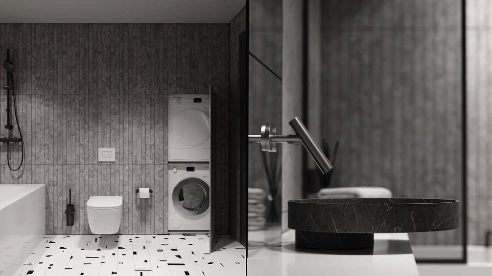 A beautifully crafted 3D bathroom scene designed with a sophisticated mix of gray-toned tiles and striking black-and-white accents, creating a sleek and modern aesthetic. This compact yet functional space features cutting-edge, ultra-modern furniture and fixtures, making it ideal for designers and architectural visualizers looking to master the art of realistic rendering in small spaces.With detailed PBR materials, custom lighting setups, and thoughtfully curated design elements, this model serves as an excellent foundation for learning how to achieve lifelike visualizations. Whether you’re exploring reflective surfaces, perfecting intricate material details, or experimenting with lighting in tight layouts, this scene offers valuable insights to elevate your skills. Perfect for those specializing in realistic and modern interior design visualization.