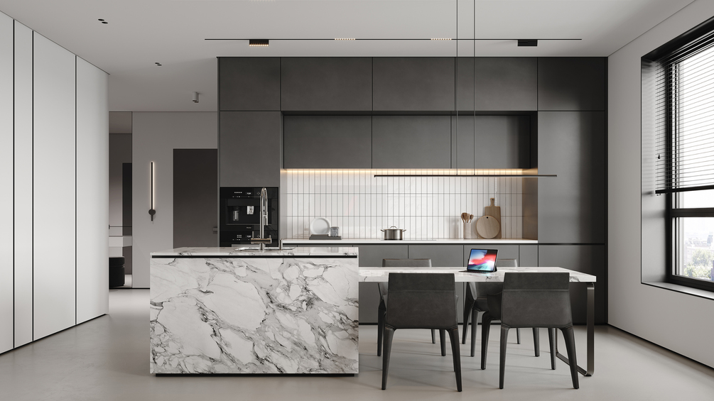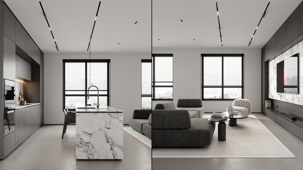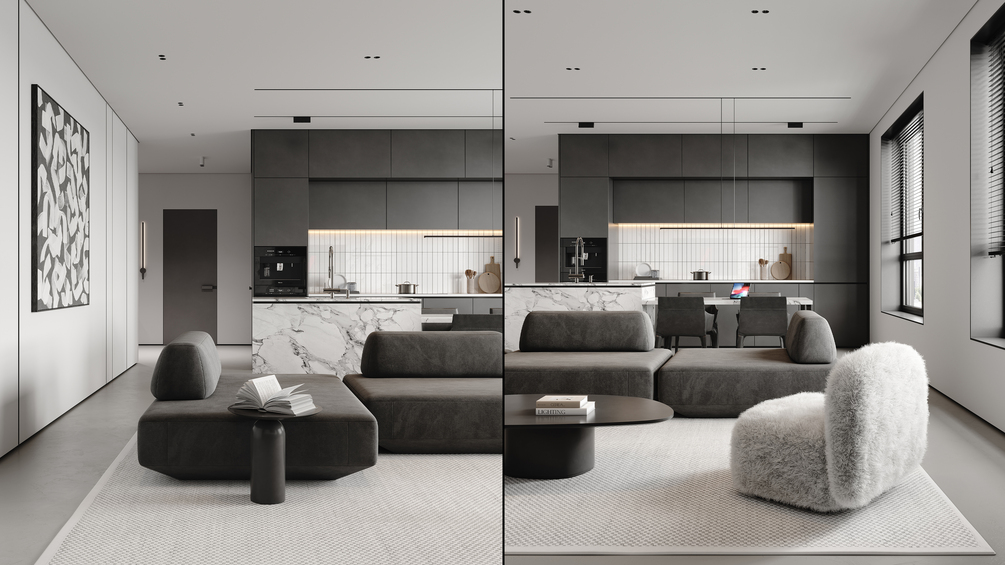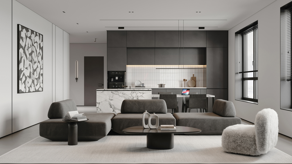 A beautifully designed 3D scene featuring a modern living room, a sleek open kitchen, and a stylish hallway, all brought together with a cohesive gray-toned, minimalist aesthetic. This space combines clean lines, functional design, and contemporary elegance, making it a perfect resource for designers and architectural visualizers looking to refine their skills in realistic rendering.Featuring detailed PBR materials, a custom lighting setup, and thoughtfully selected elements, this model provides a comprehensive foundation for mastering lifelike visualizations. Whether you’re experimenting with open-plan layouts, enhancing material realism, or perfecting lighting techniques, this scene offers valuable insights to elevate your work. Ideal for those specializing in modern and minimalist interior design.